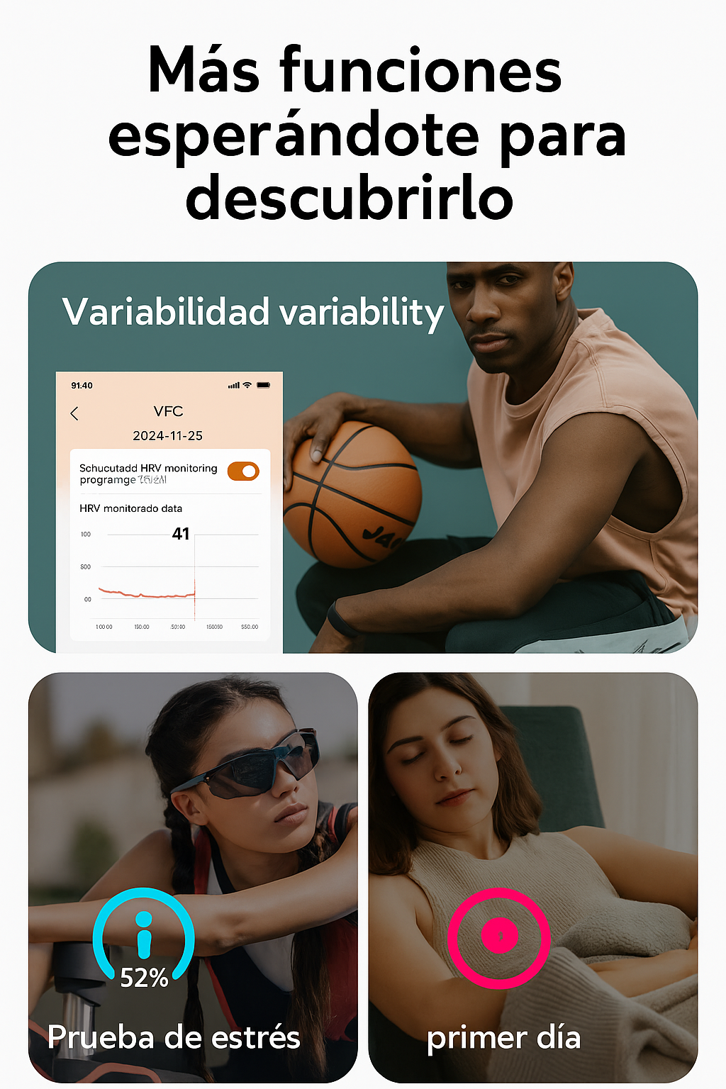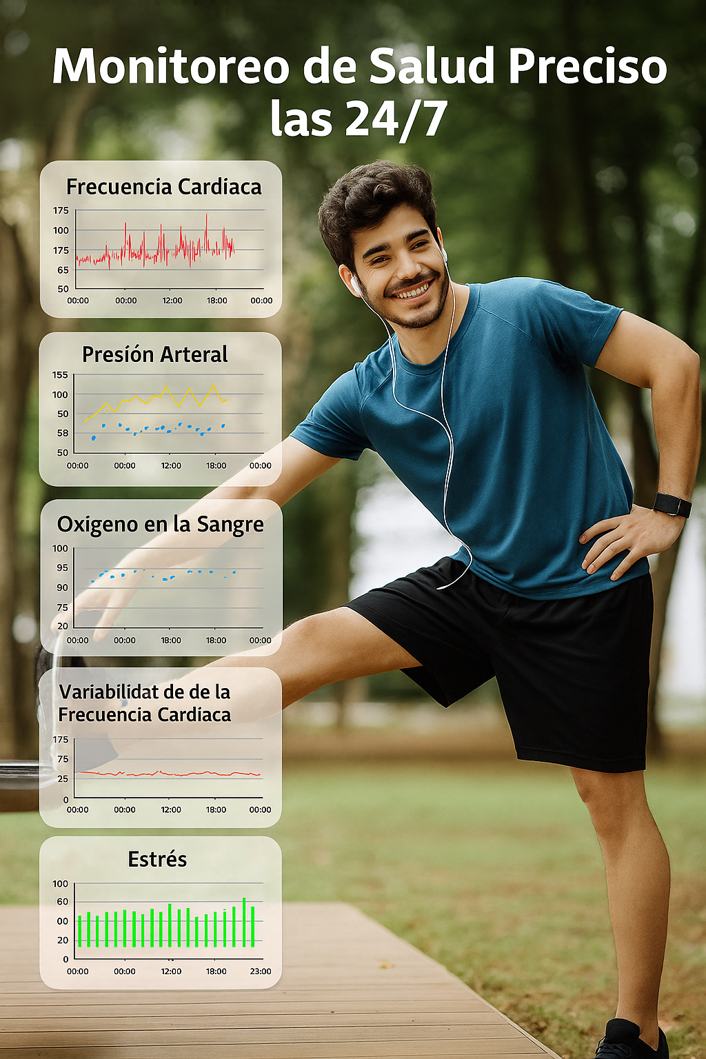 Supervisa tu frecuencia cardíaca, presión arterial, oxígeno en sangre, variabilidad de la frecuencia cardíaca y niveles de estrés durante todo el día con precisión avanzada.